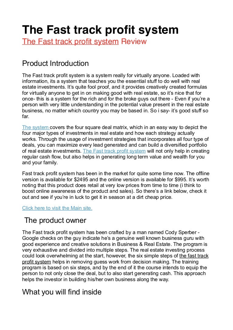 Fast track profit system. Cody Sperber Fast Track Profit System HERE IS WHAT YOU ARE ABOUT TO RECEIVE Over 20. 60 Days money back guarantee If it. Module 3 Deal Analysis and Negotiation.