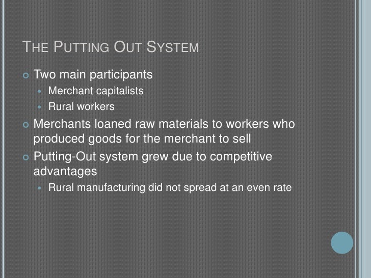 What is putting-out system How is it advantage for Weavers. The putting-out system was the production of goods in private homes under the supervision of a merchant who put out the raw materials paid a. Learn puttingoutsystem with free interactive flashcards.
