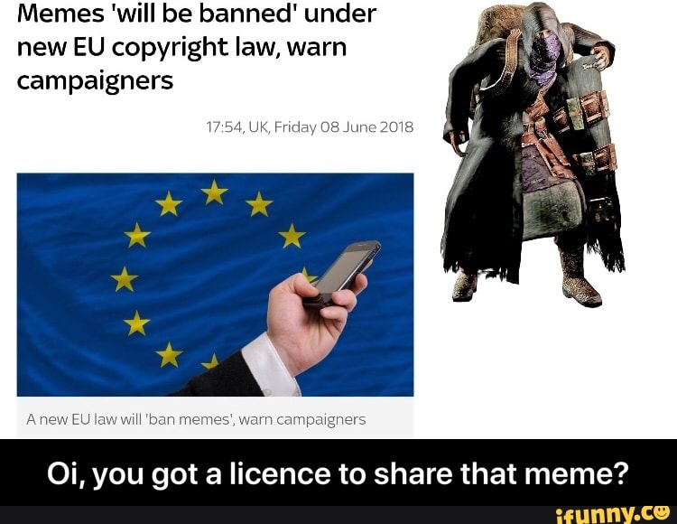 Creator is Soggynugget on instagram. Youve Got A Licence For That Memes - 2806 results. The best site to see rate and share funny memes. War eu meme ban. - 9GAG has the best funny pics gifs videos gaming anime manga movie tv cosplay sport. A way of describing cultural information being shared. Basically on June 20th the EU will vote on an article that would heavily censor the internet including banning using any copyrighted material even under free speech as well as just overall censoring it so 99 of it cant be used in Europe. Downvote this comment if the meme sucks. Open so yall behave.